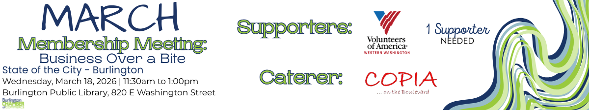 Enjoy a delicious lunch catered by Copia on the Boulevard, and thank you to our meeting supporters, Volunteers of America, for helping make this event possible. We do have one more opportunity for a Supporter! Please let Emily know if you are interested (emily@burlington-chamber.com)